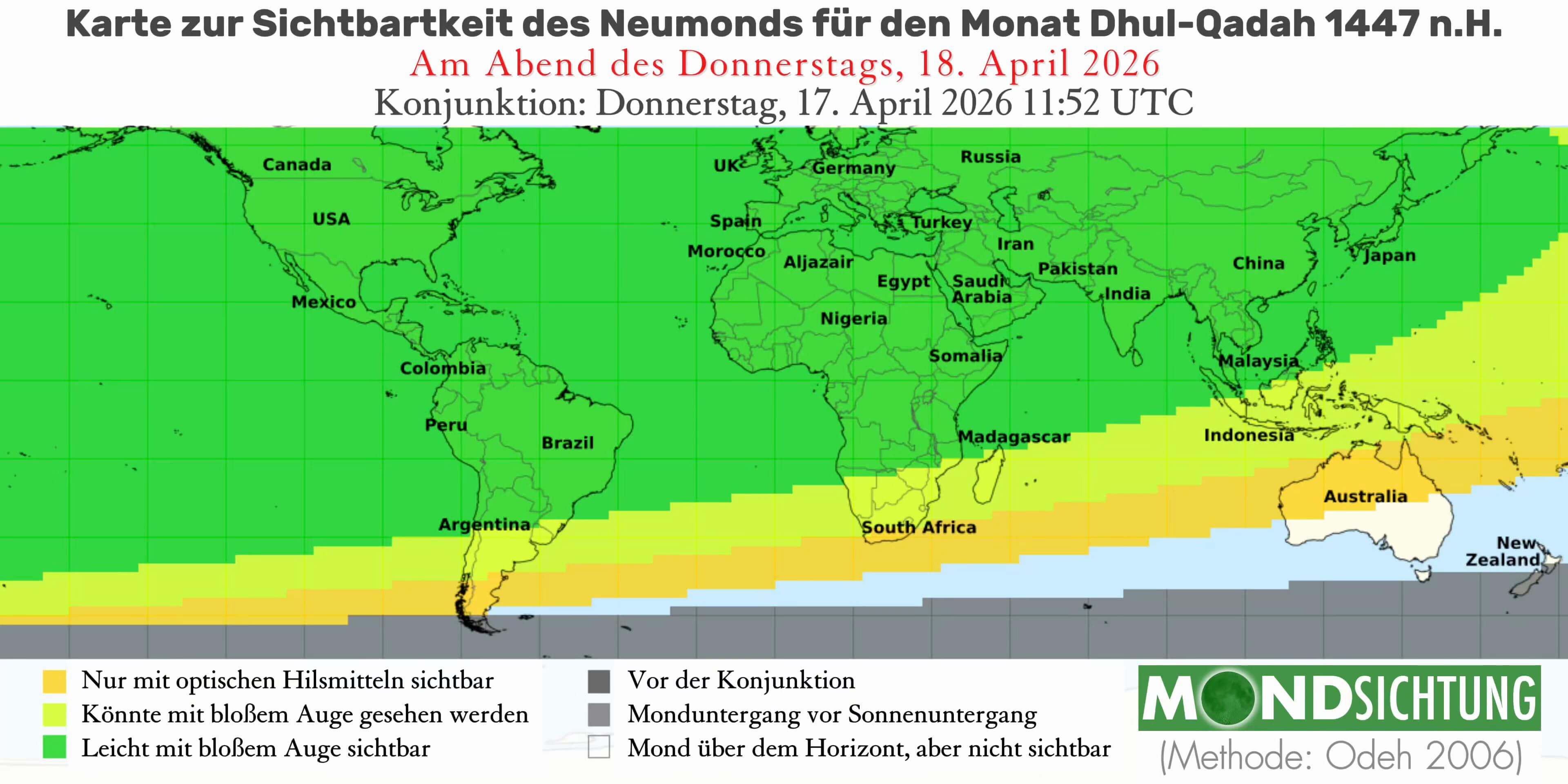 Die geozentrische Konjunktion (astronomischer Neumond) findet am 17. April 2026 um 11:52 UTC (13:52 MESZ) statt. Die vorliegenden Karten zeigen die Sichtbarkeit der neuen Mondsichel (Hilâl) am Abend des 17. April 2026 basierend auf der Methode von Mohammad Odeh (Odeh-Kriterium).