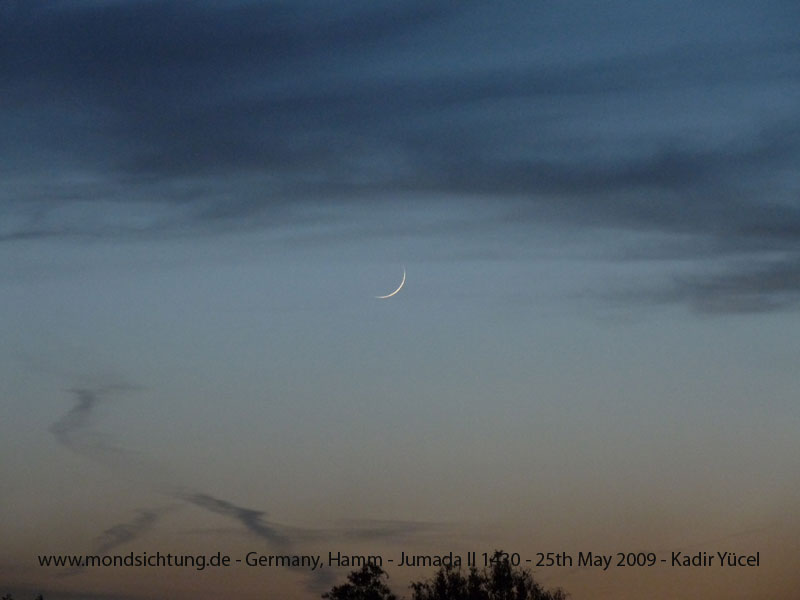 Gegen Nachmittag zogen Gewitterwolken über Hamm (Westf.), die eine Sichtung anscheinend unmöglich machen würden. Erst nach Sonnenuntergang lockerte der westliche Horizont auf. Bis die letzten Wolken, die eine Sichtung des Mondes verhinderten, weiterzogen, dauerte es dreiviertel Stunde. Genau um 22.15 Uhr sahen Frau und Herr Yücel die Mondsichel für den Monat Jumâdâ l-âkhira 1430 n.H.. Die Fotos entsanden bei dieser Mondbeobachtung.